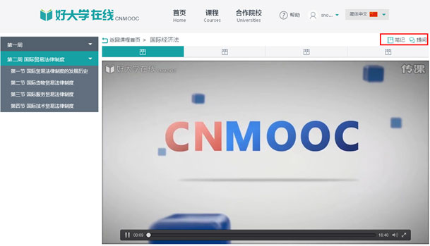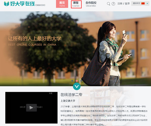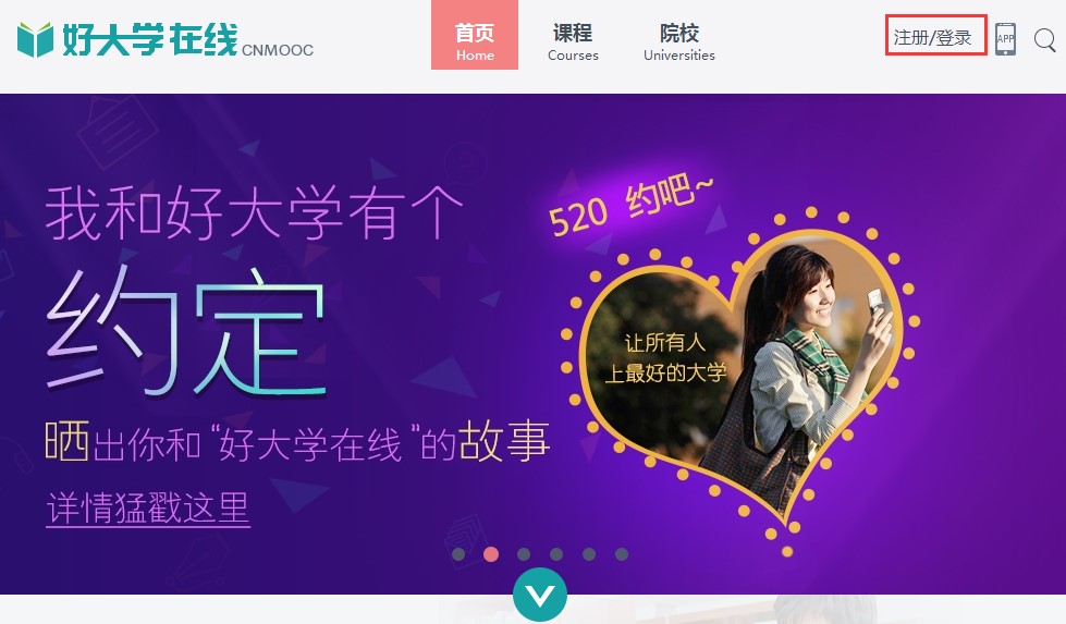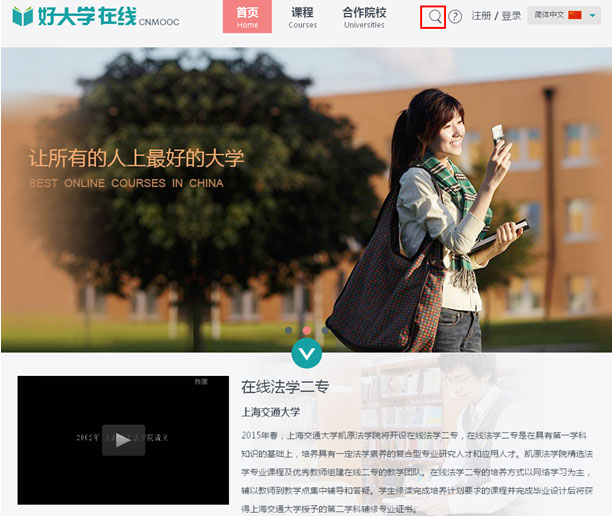 1、登录网址http://www.cnmooc.org,进入好大学在线的首界面,点击右上角的登录/注册。