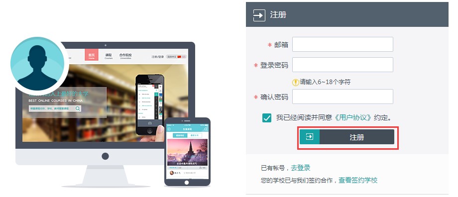 答:请输入上海商学院移动学习平台的网址http://www.cnmooc.org,在网站首界面的右上角找到登录/注册, 点击其后会出现登录/注册界面,想要注册新的账号,点击下方的“注册”, 按界面提示输入电子邮箱、密码,点击注册后我们将发送给您验证邮箱邮件, 点击邮件中激活账号链接,即可完成注册。