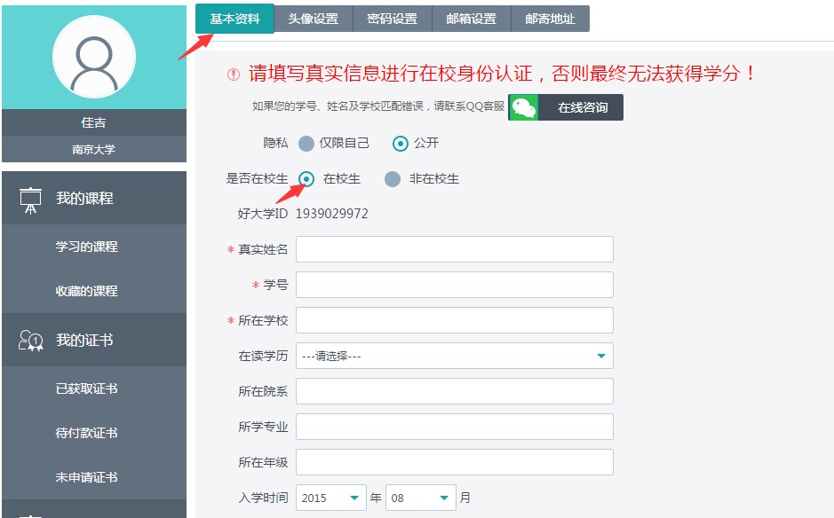 答:完成邮箱验证激活后,第一次登录系统,可以点击”去认证“完成在校身份认证。 在“基本资料”页面,请填写您的相关信息,学号,所在学校等信息。或是登录系统后, 进入“个人设置”的“基本资料”页面完成信息录入。您的个人信息必须填写正确,才能通过在 校生认证,完成修学分课程学习后,我们将根据这个信息向学校提供成绩,如果您已经认证 的信息有误,请联系我们的客服进行修改。