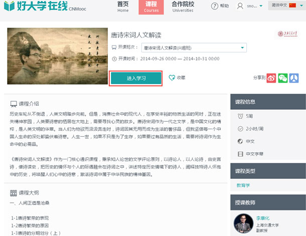确认选课后,课程详情界面中按钮文字“加入课程”变为“进入学习”。如下图所示: