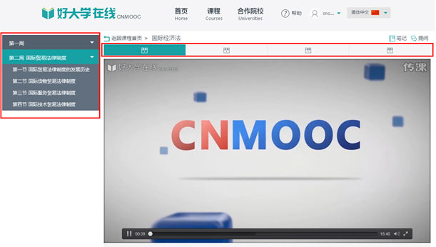 (3)、点击视频标志后进入观看界面(如下图所示)。此外, 可点击屏幕左侧导航章节目录进行观看其他章节的内容,也可点击右侧小节内容标志进行切换观看。