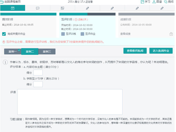 为同业互评的主观练习设置互评案例,预先训练学生批阅作业能力。