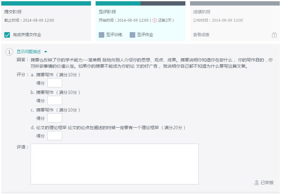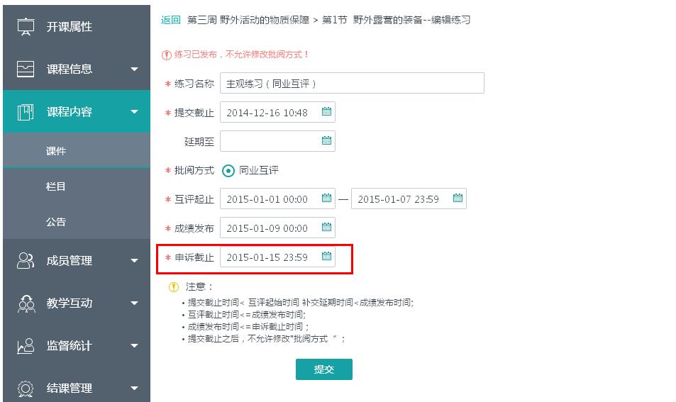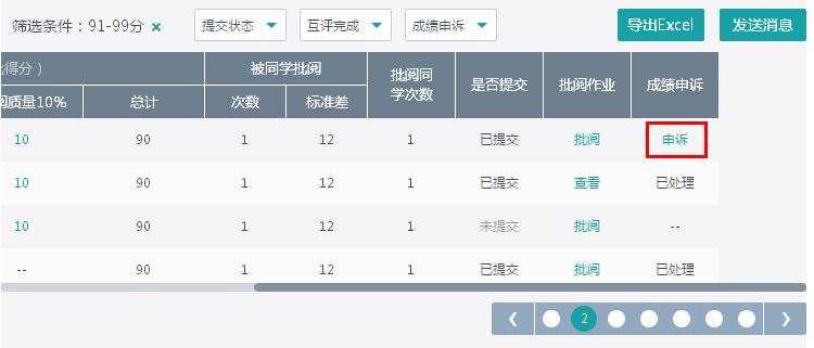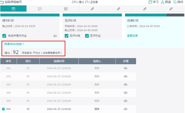 ● 申诉截止时间:成绩公布后,学生在一段时间内可以对互评成绩进行申诉;