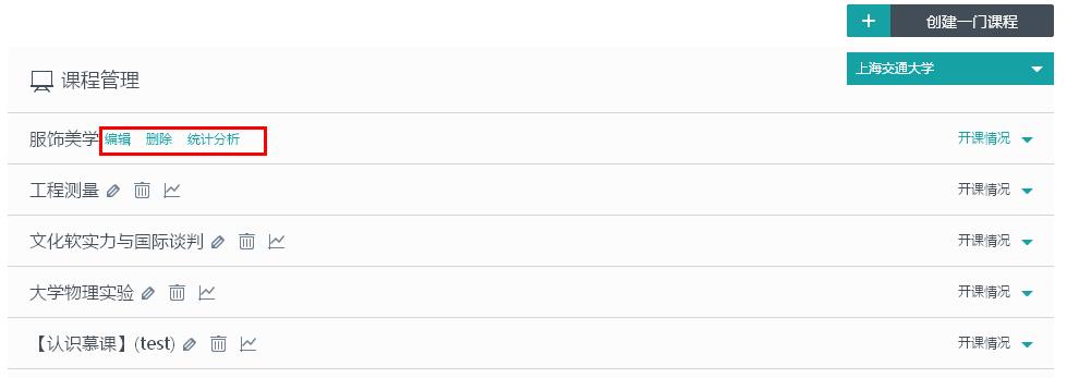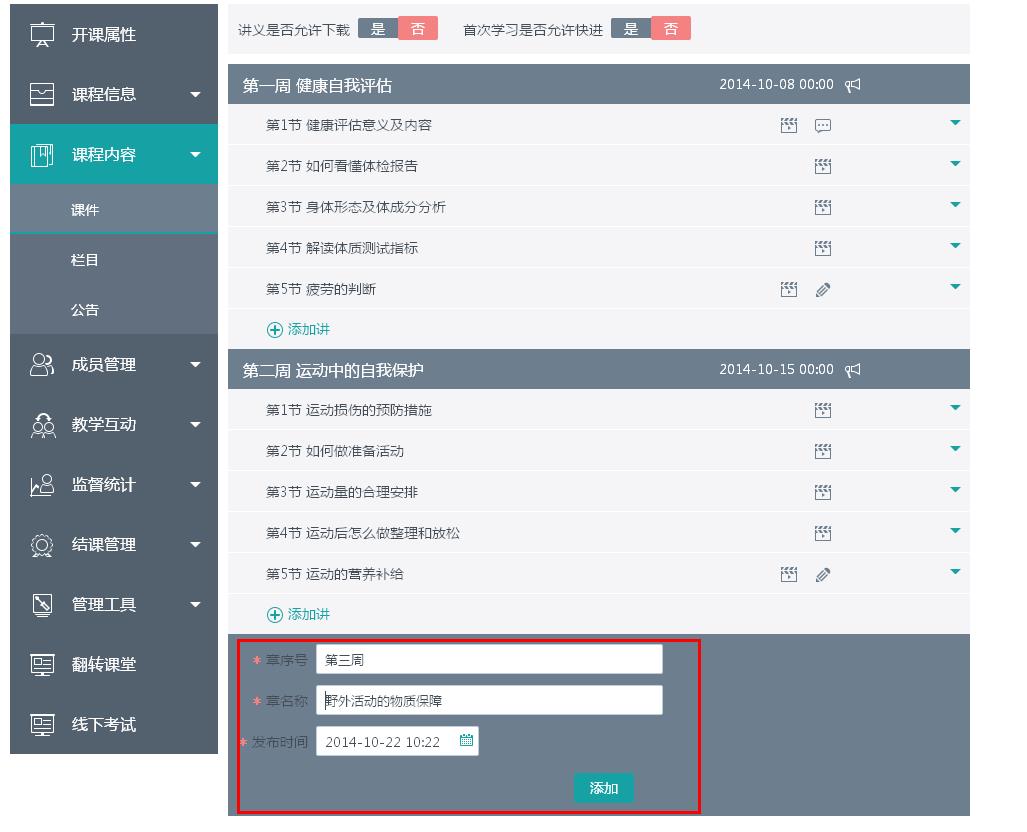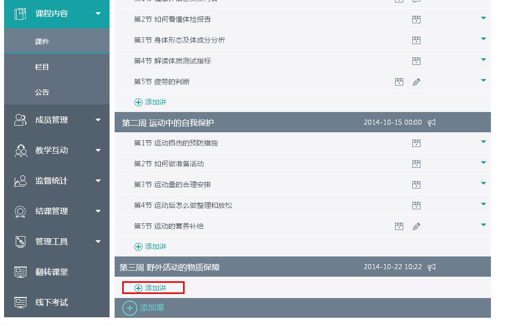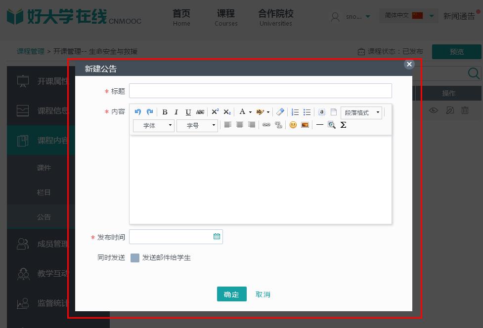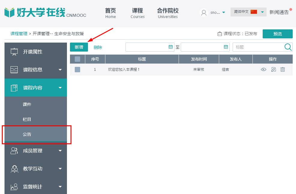 进入开课管理页面,点击左侧导航栏“课程内容”中公告,进入本次开课的公告管理页面,