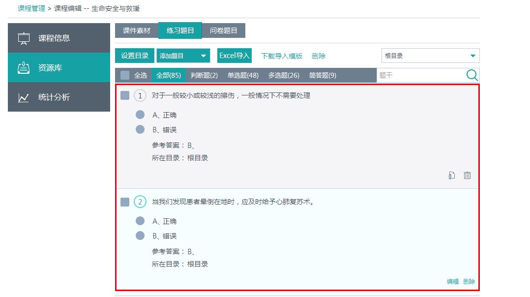 最后点击“提交”完成添加主观练习。回到章节列表页面,可以对已添加练习进行编辑设置、案例设置和排序等操作。