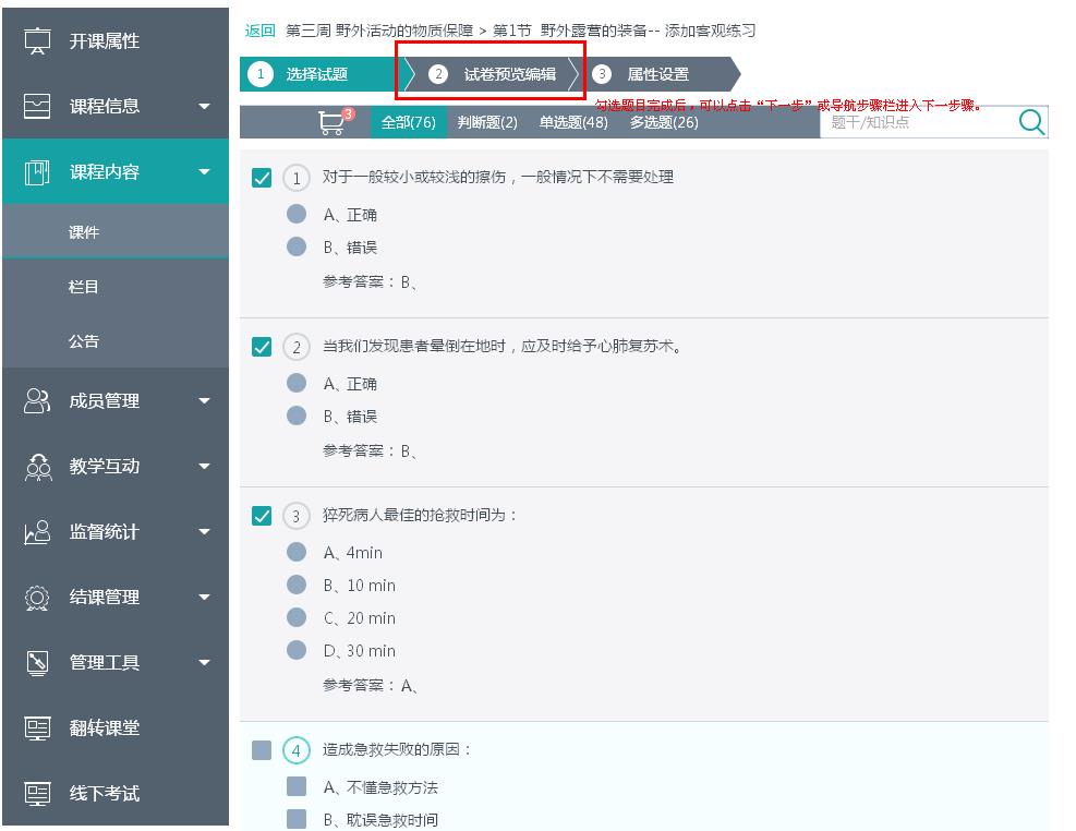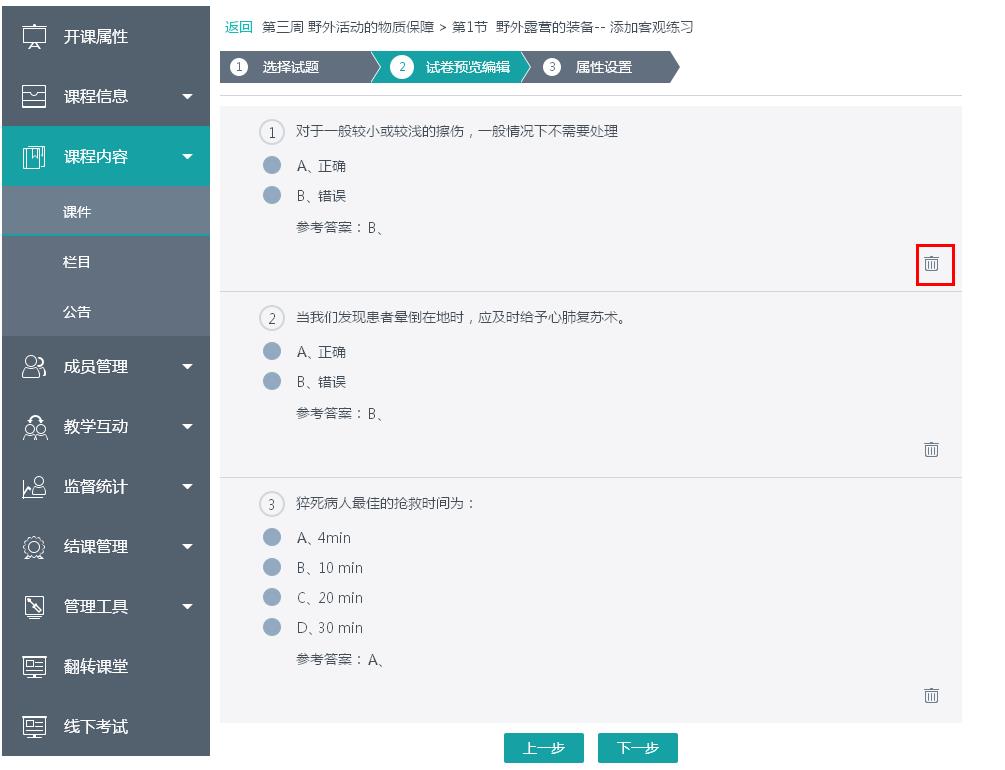 进入试卷预览编辑页面,可以对上一步骤选中题目进行确认和点击删除图标进行删减。