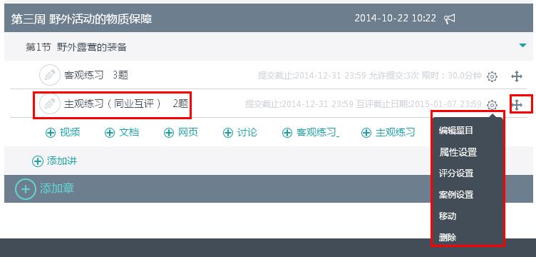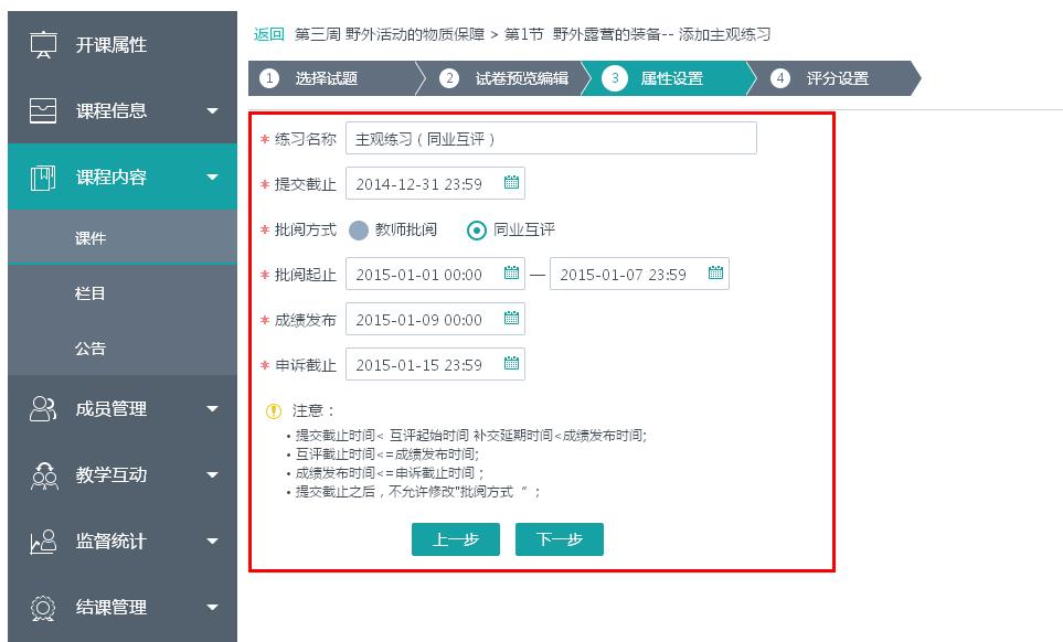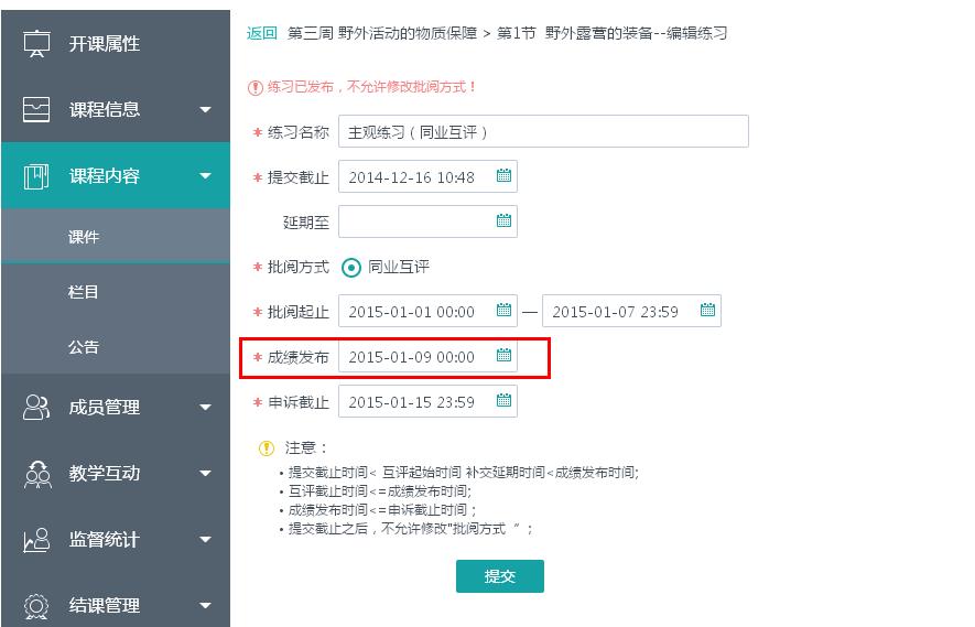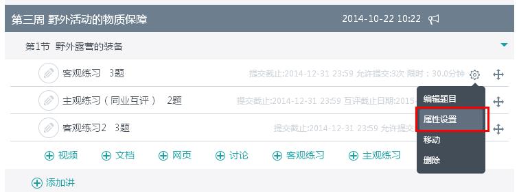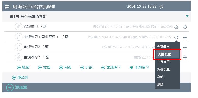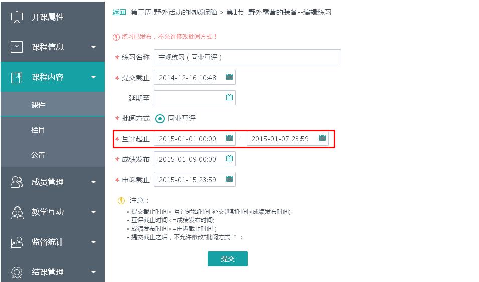 进入属性设置页面,修改练习的互评截止时间,即修改如下图所示的互评起止时间。