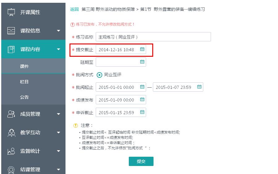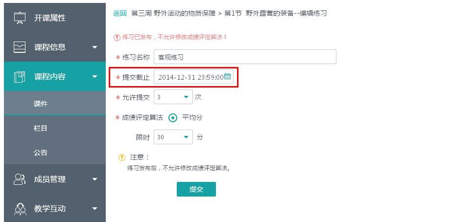 进入属性设置页面,修改练习的提交截止时间。如果提交截止后,可以设置延期补交时间,为未提交学生提供提交练习机会。