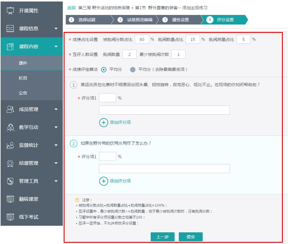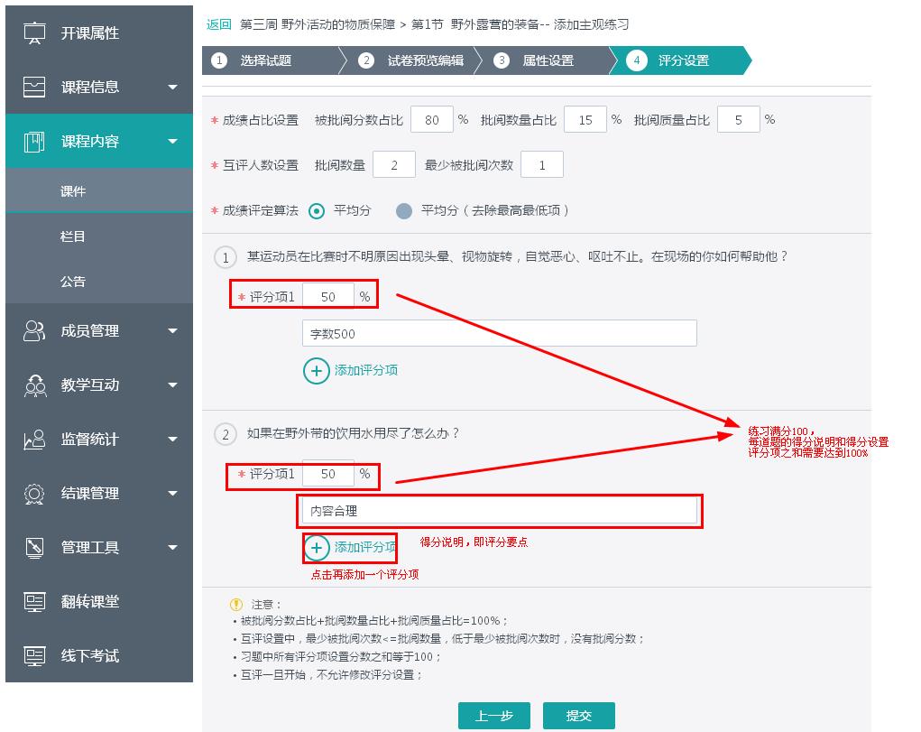 第四步:评分设置,主要是针对同业互评的主观练习进行设置。设置说明: