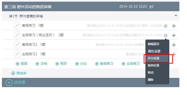 鼠标点击练习中设置图标,在弹出下拉菜单中点击“评分设置”链接,