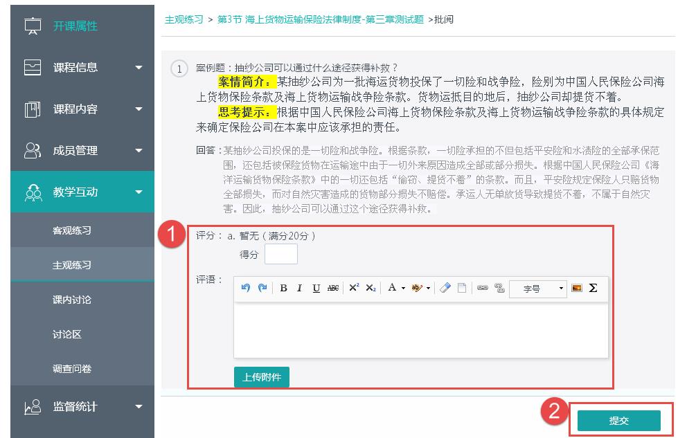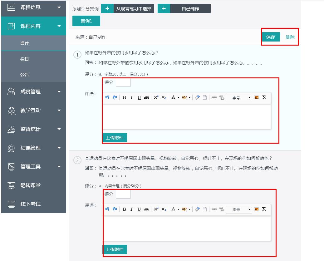 点击确定后,回答设置案例页面。对其进行批阅填写评分和评语,最后点击保存。