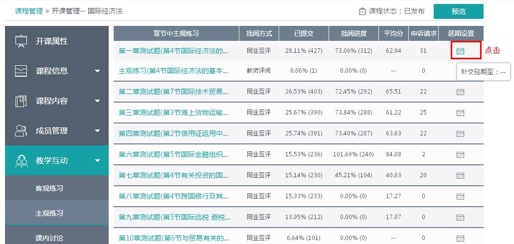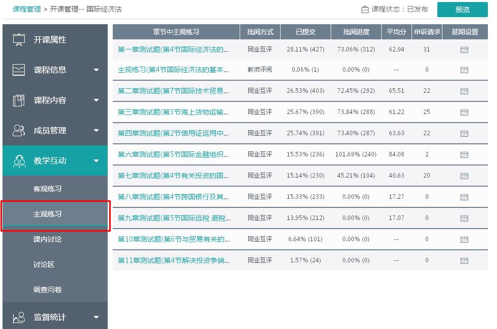 在开课管理页面,点击教学互动中主观练习,进入主观练习列表页面,如下图所示。