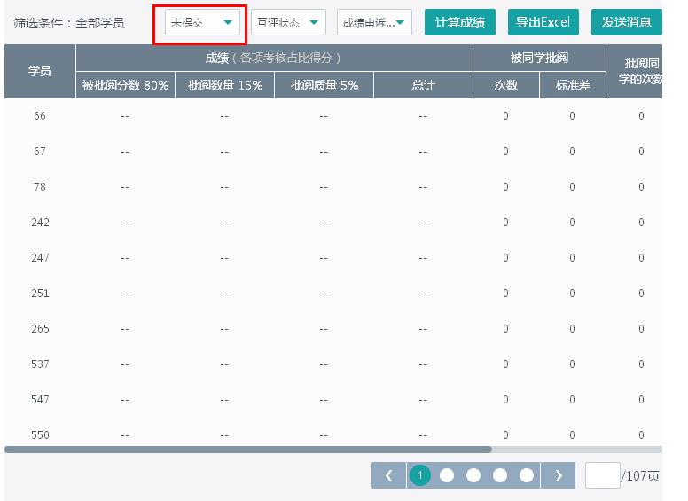 举例说明2:对未完成批阅任务的学生发送消息。互评状态中选择:批阅未完成(被批未完成)或 批阅未完成(被批完成)进行过滤筛选未提交的学生。