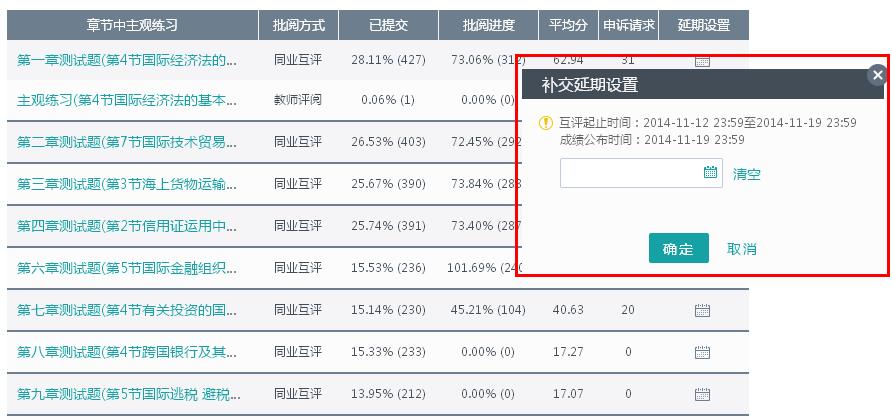 如果练习提交时间已截止,但还有很多学生没有提交。可以在此处直接设置延期补交截止时间。点击日历图标,弹出设置补交延期时间。